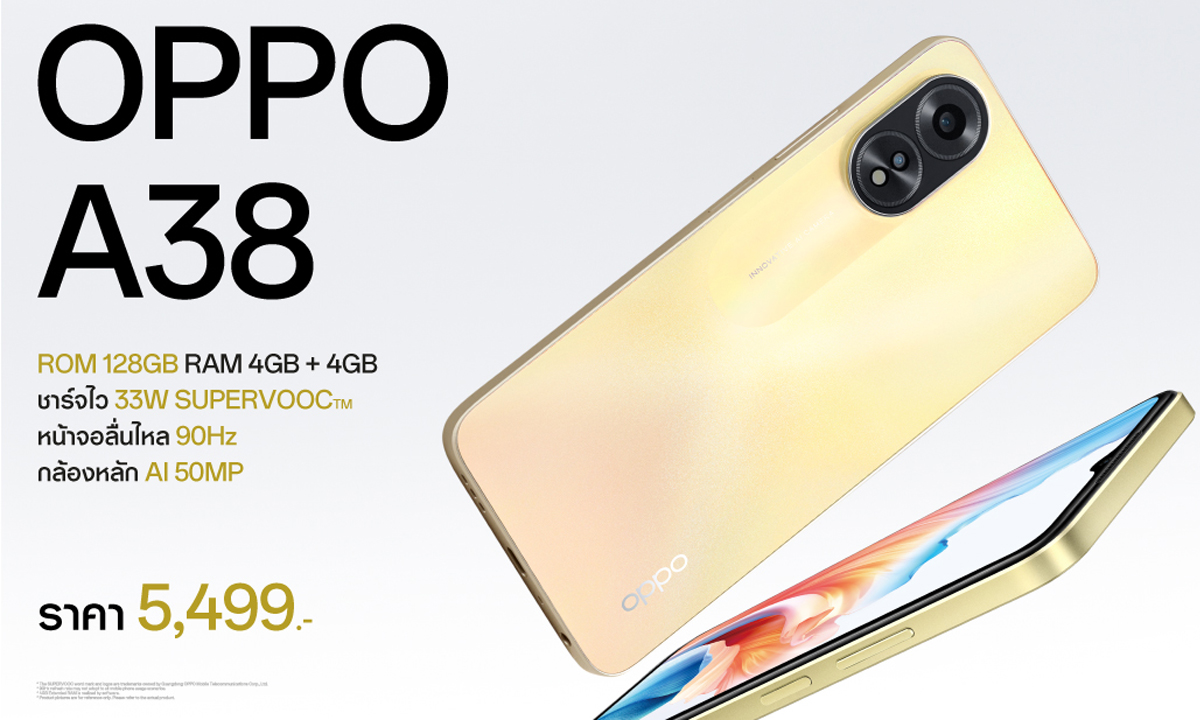 ออปโป้ ไทยแลนด์ แบรนด์เทคโนโลยีชั้นนำระดับโลก วางจำหน่าย “OPPO A38” สมาร์ตโฟนระดับเริ่มต้นรุ่นใหม่ล่าสุดจาก OPPO A Series อย่างเป็นทางการในประเทศไทย พร้อมมอบประสบการณ์การใช้งานคุ้มค่า ตอบโจทย์ทุกเอ็นเตอร์เทน ด้วยการมาพร้อมหน่วยความจำจุใจ ROM 128GB และ RAM 4GB เพิ่มได้อีก 4GB ใช้งานได้ลื่นไหลไม่มีสะดุด